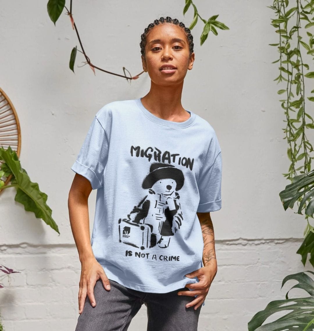Check out the Migration Is Not A Crime design, now available on an organic cotton T-shirt up to size 24.